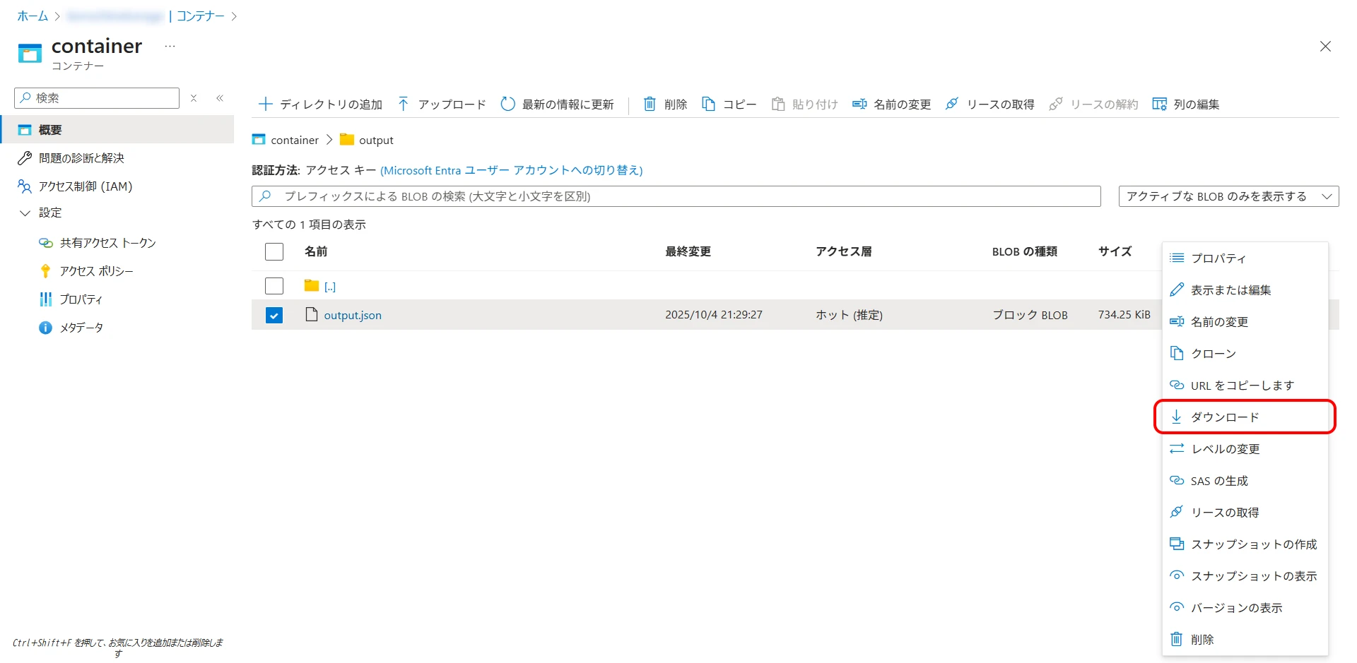 Navigate to the Blob Storage container/directory specified as the output destination. The file will be created, so select "Download" from the context menu (Figure 25).