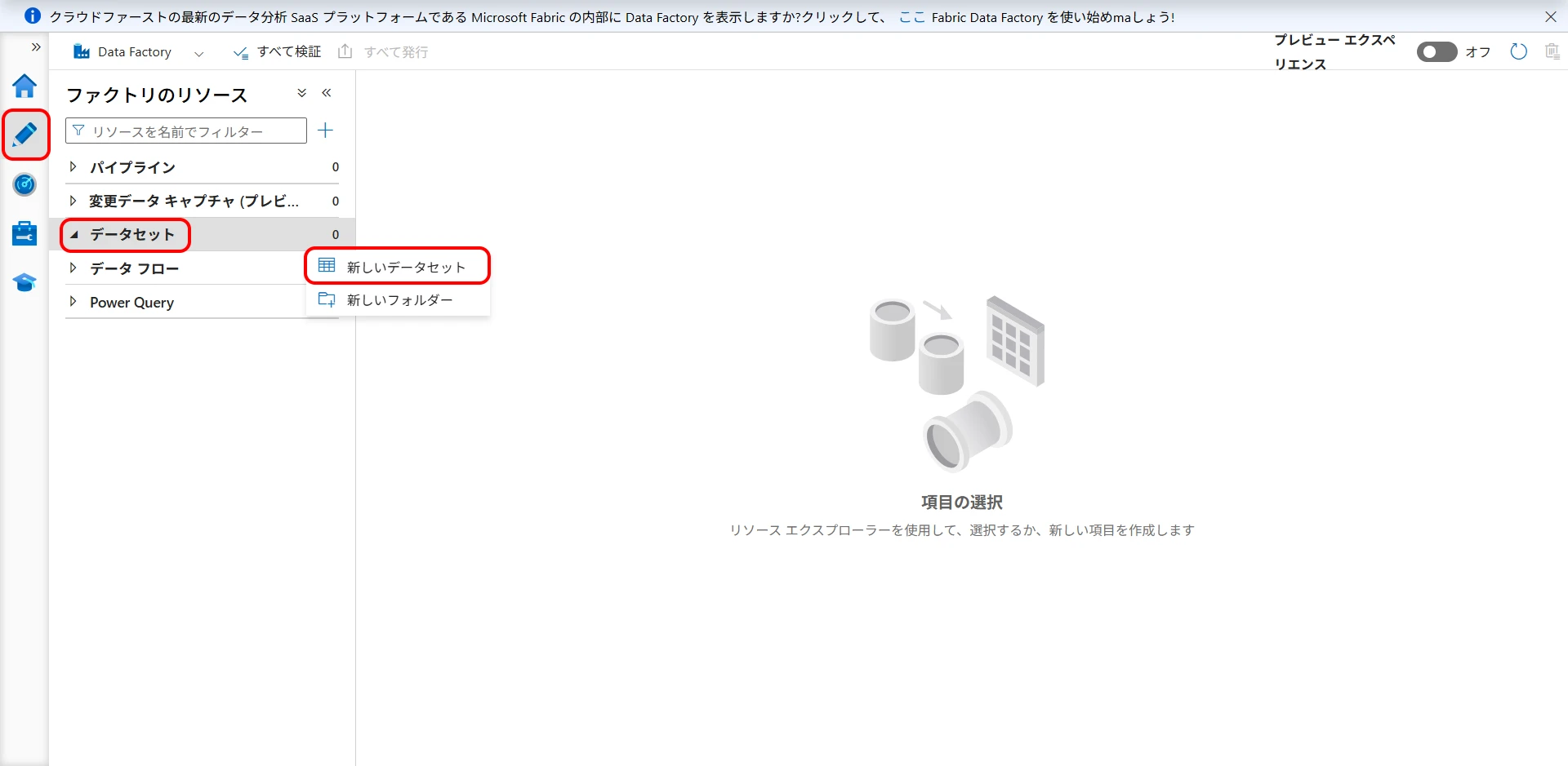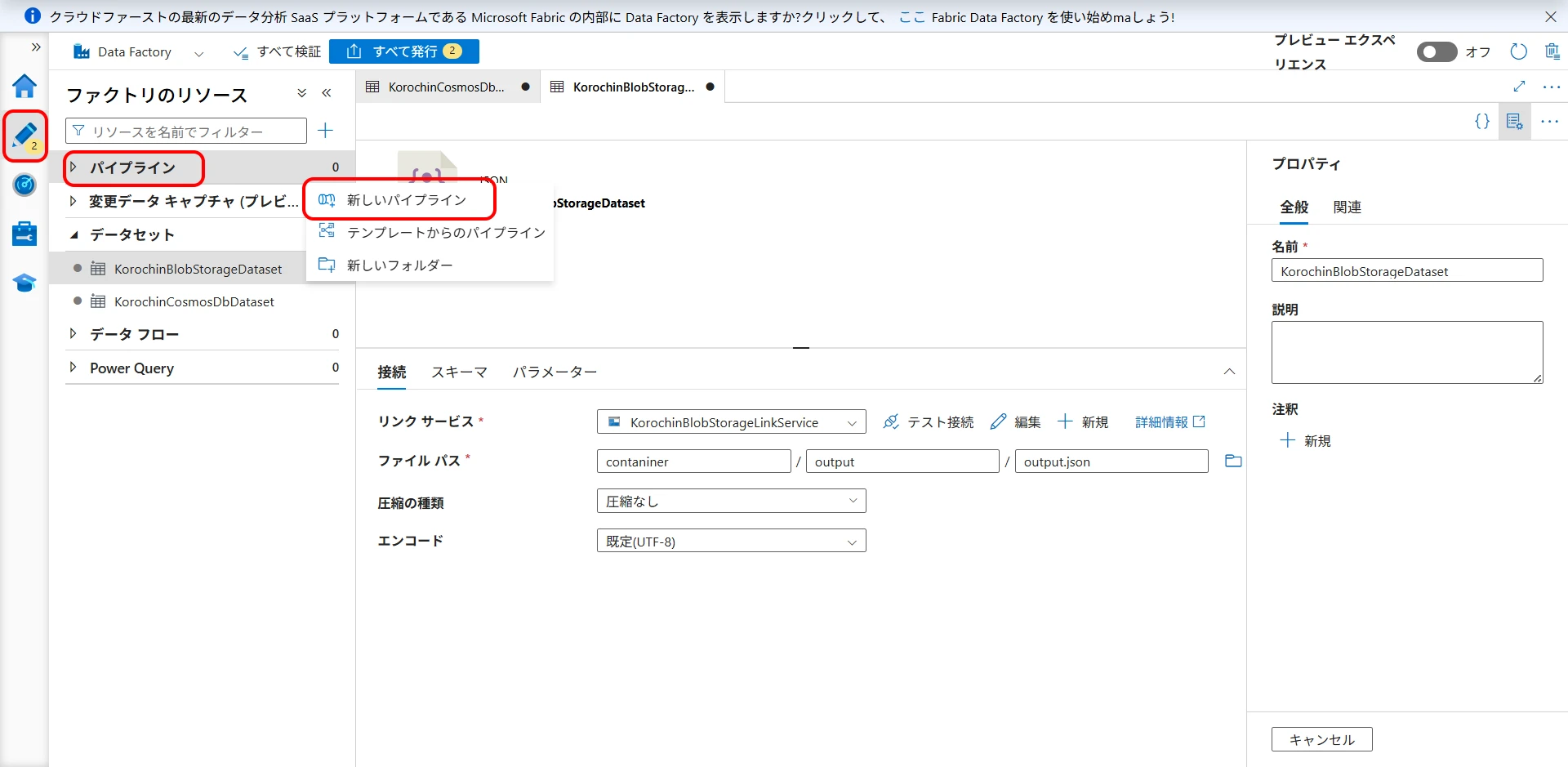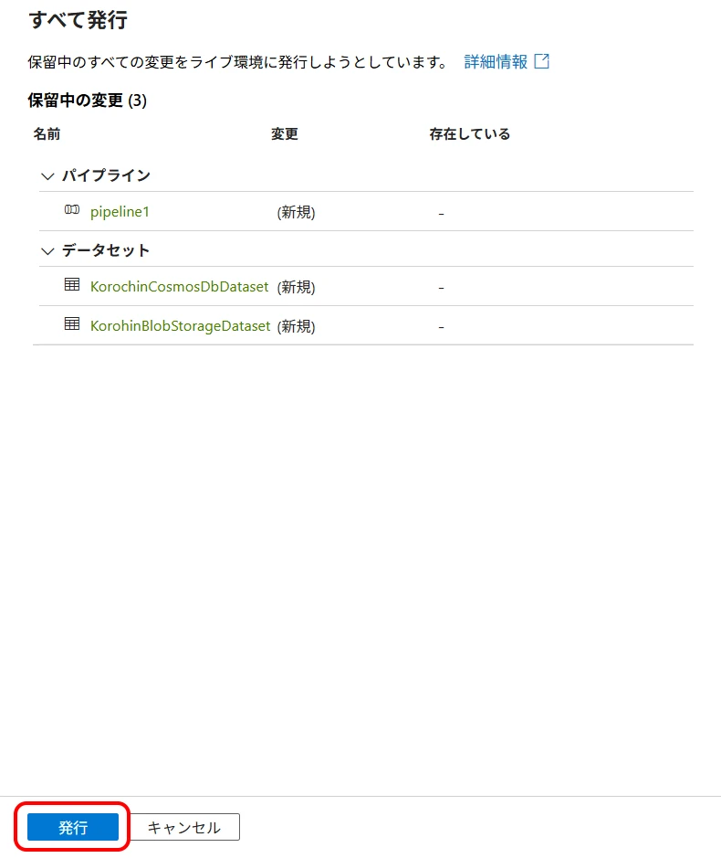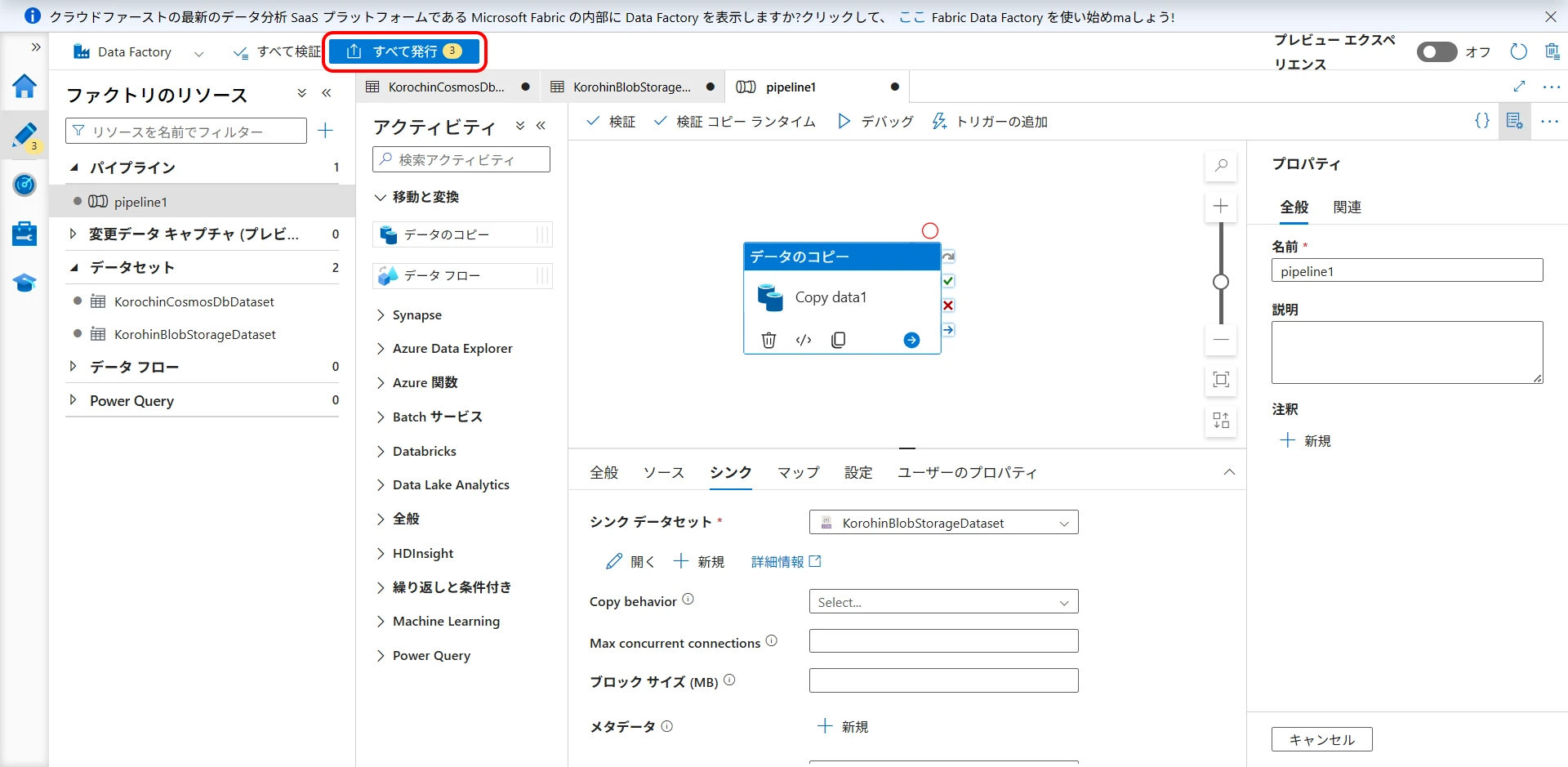 Now, click "Publish all" to confirm the creation (Figure 21, Figure 22). If you do not publish, the created datasets and pipelines will disappear when you close the browser. (Linked services will remain).