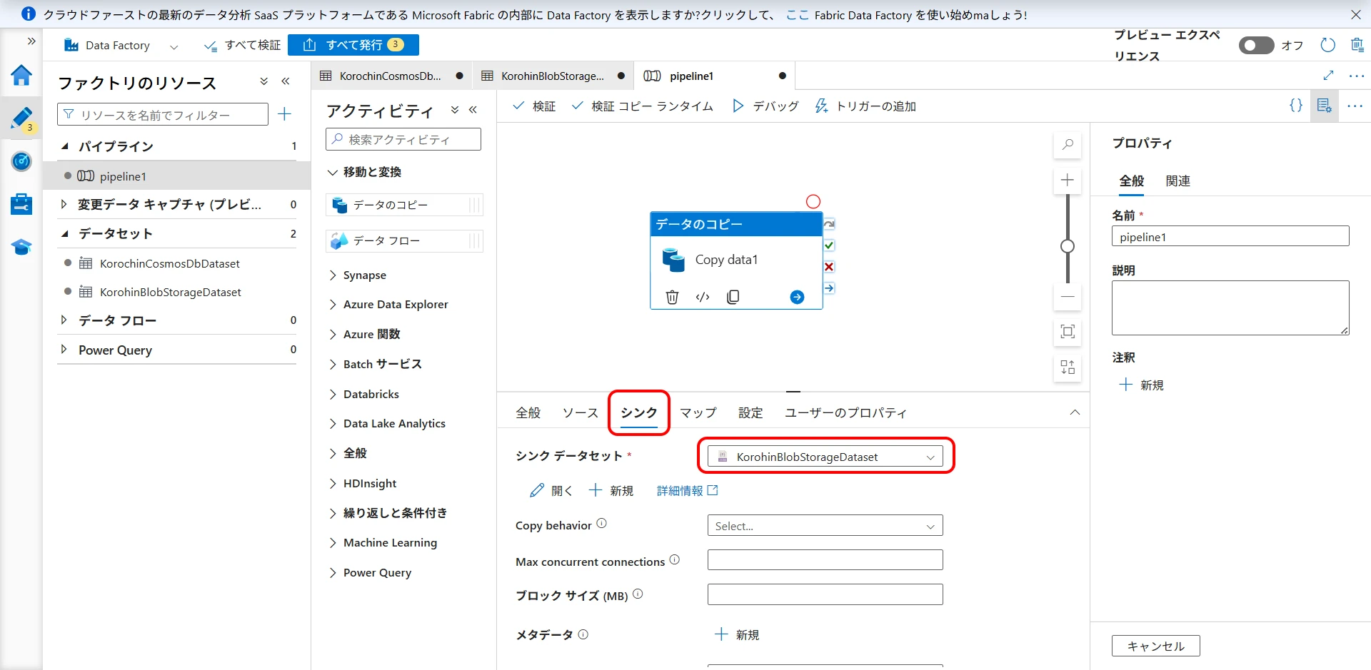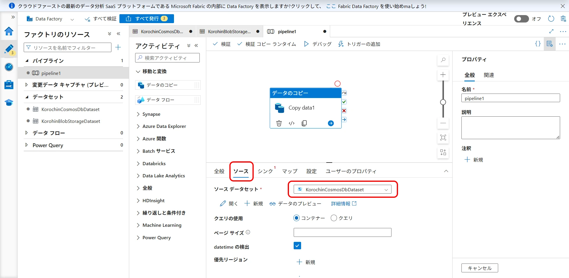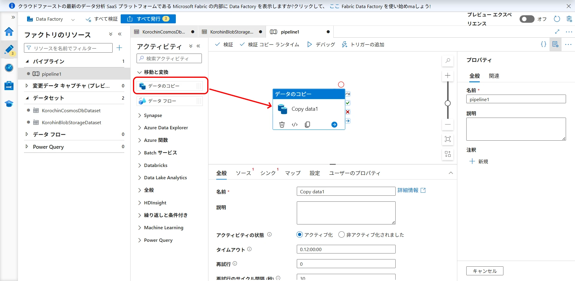 Create a pipeline to copy data from Cosmos DB to Blob Storage.