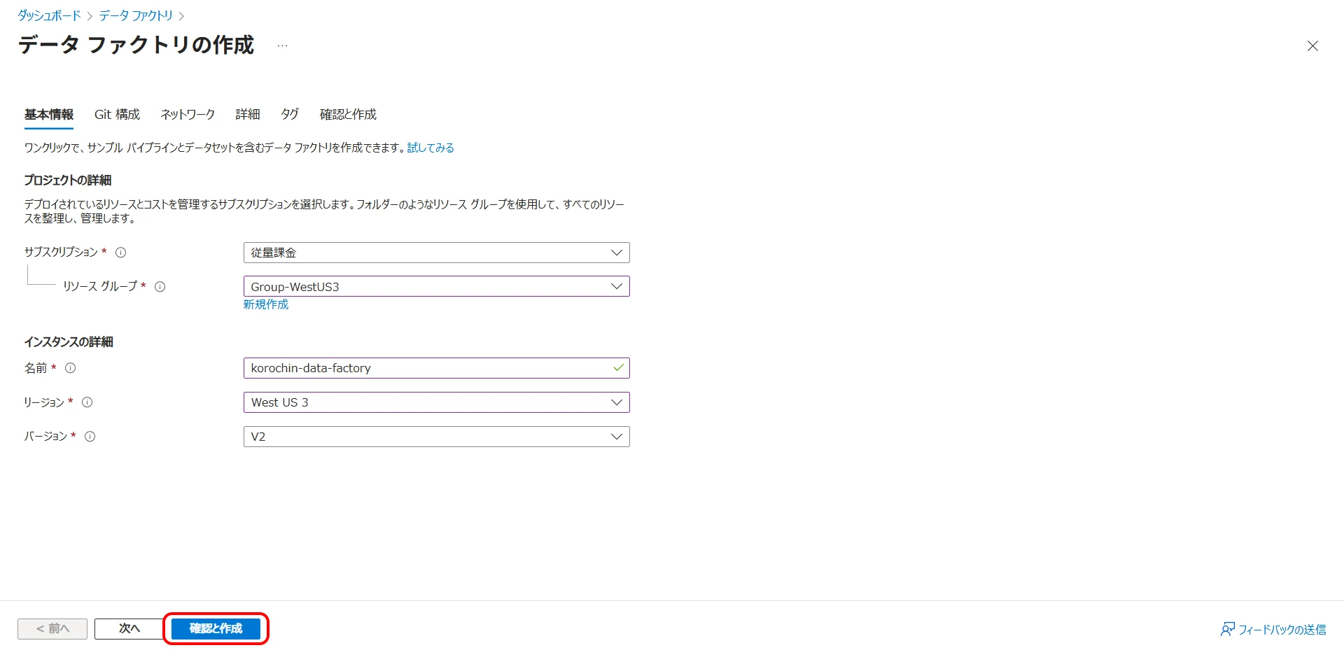 Select and enter each of these. Choose "V2" for the version and click "Review + create" to create the data factory.