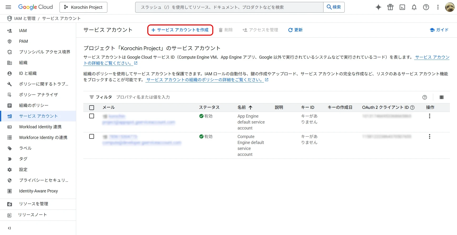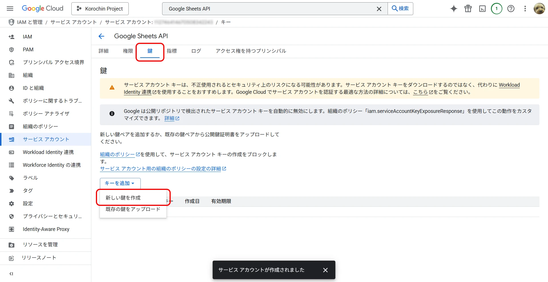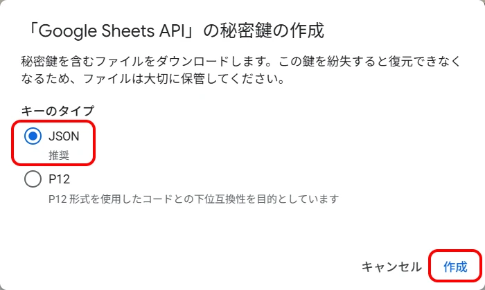 In the "Keys" tab of the created service account, click ADD KEY > Create new key (Figure 3), select JSON as the key type, and download it (Figure 4). The JSON file will be used for API calls from your program. This JSON file contains credentials for accessing the API, so keep it secure.