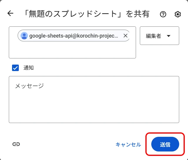 Next, add the service account created in step 2 as an editor to your Google Drive spreadsheet. Click the "Share" button in the upper right, and enter the service account's email address in the input field (Figure 5). When the screen changes (Figure 6), confirm that "Editor" is selected and click the "Send" button.