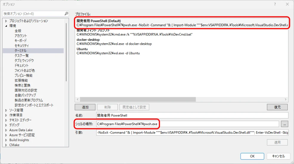 To change the PowerShell version executed in Visual Studio 2022 to 7, modify the settings from Options. Tools > Options > Environment > Terminal > Developer PowerShell Change "Shell location" from